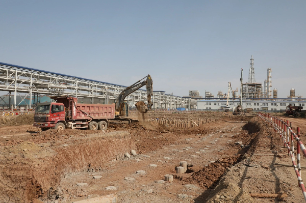 在新疆新业能源化工有限责任公司年产6万吨聚甲醛项目施工现场,工人们正在紧张有序地进行桩基施工作业。