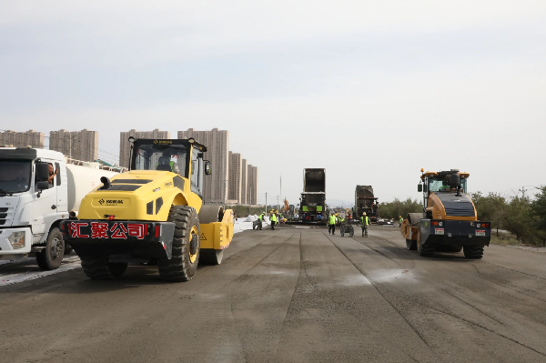 在第六师五家渠——乌鲁木齐机场公路项目建设现场,摊铺机、压路机协同作业,施工人员正抢抓工期推进路面施工。项目总投资7.37亿元,采用“大吨位摊铺机一次成型”工艺,建成后将大幅缩短五家渠市至乌鲁木齐市的通行时间。